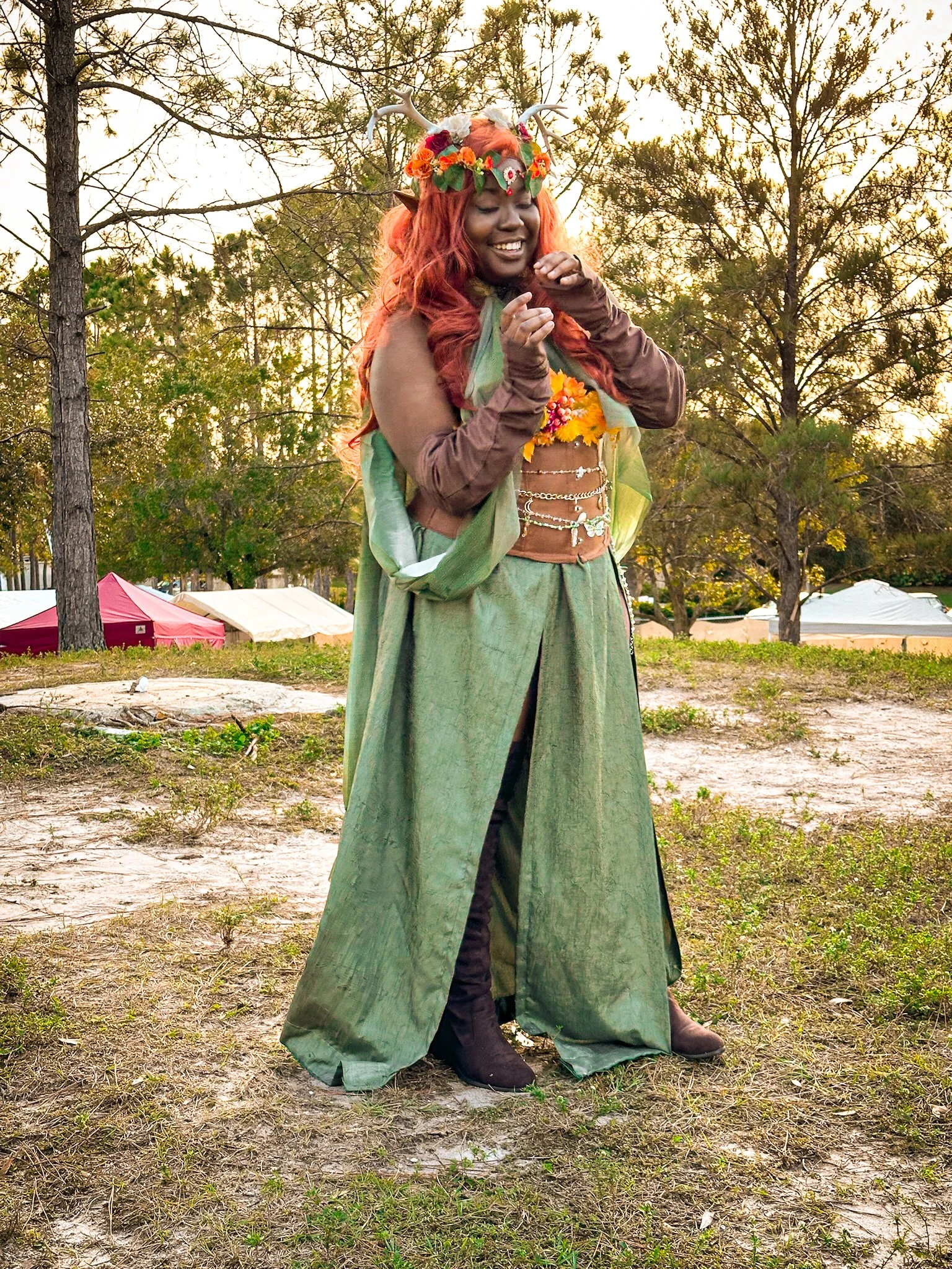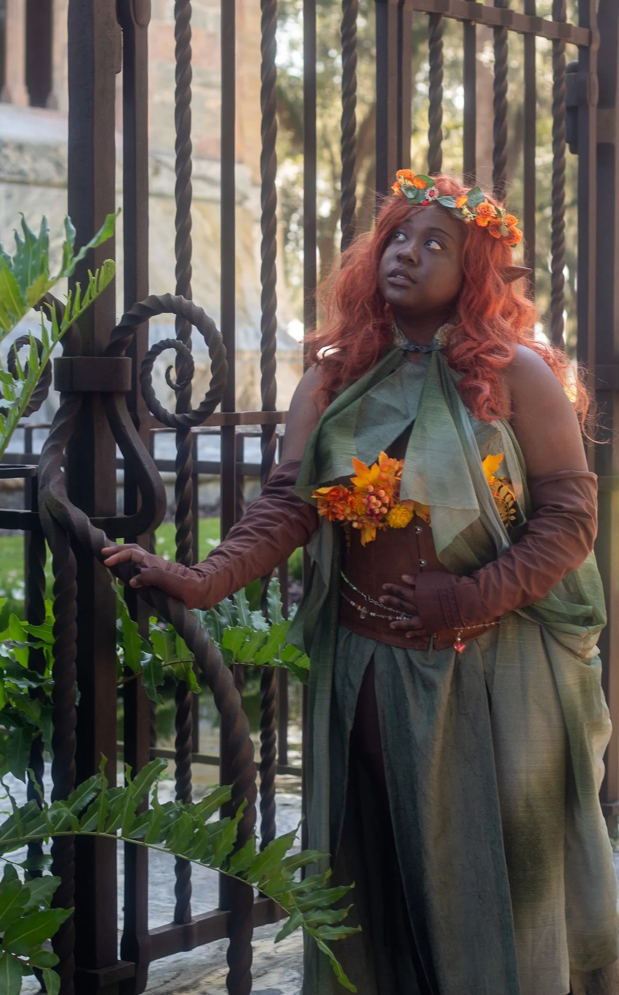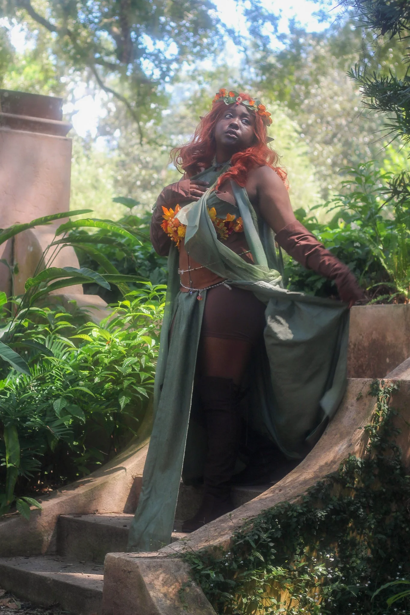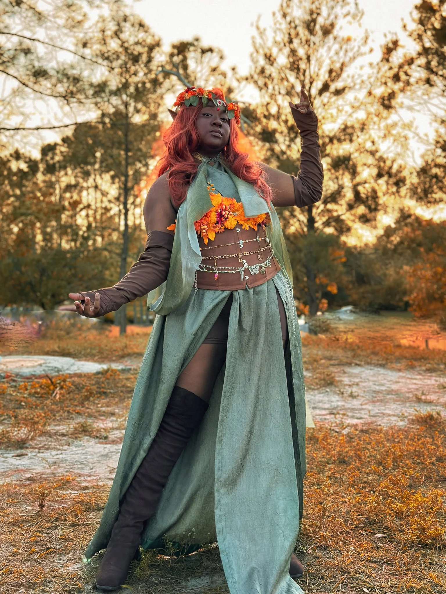 One of my proudest costumes, Keyleth, is a wonderful character from Critical Role, and another character I dedicated to my friends. I based my design vaguely on one of her character designs and inspired by a couple of artists. Her pieces are mostly made out of thrifted materials, such as bed sheets and curtains being the main two, along with fake leaves I already had lying around! More detailed images or information can be requested via email.
